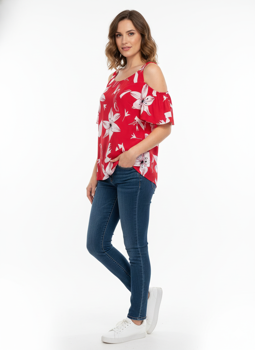 ¡Dale un toque de color a tu clóset! Esta blusa en un vibrante tono rojo con estampado de lirios blancos es la pieza que necesitas para tus días de sol. Su diseño cold shoulder (hombros descubiertos) y tirantes delgados le dan ese aire femenino y moderno que tanto buscas.
